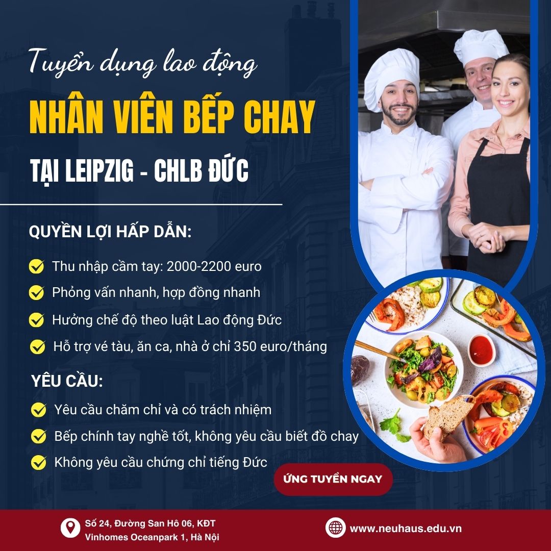 Bếp chay – gần Leipzig: Đây là cơ hội lý tưởng cho những ai muốn trải nghiệm môi trường ẩm thực châu Âu hiện đại. Ứng viên chỉ cần có tay nghề bếp vững, kinh nghiệm bếp chay chưa phải là điều bắt buộc. Mức lương cầm tay dao động từ 2.000 – 2.200 EUR/tháng, kèm theo hỗ trợ vé tàu đi lại, bao ăn ca và chỗ ở với chi phí chỉ khoảng 350 EUR/tháng.
