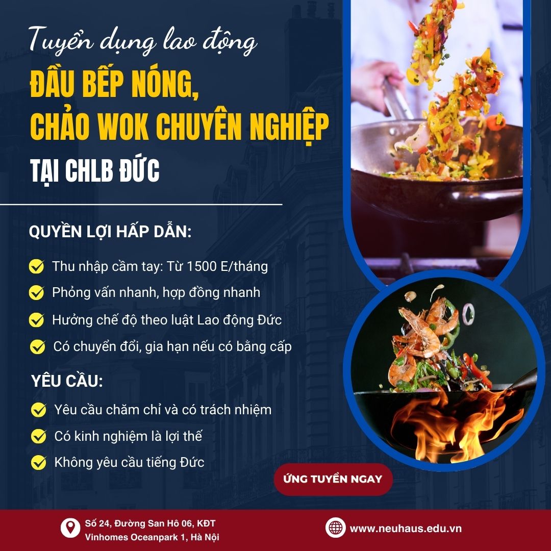 Bếp nóng, chảo wok chuyên nghiệp: Đây là vị trí được đánh giá cao bởi sự quen thuộc với nhiều đầu bếp Việt. Với kỹ năng thao tác nhanh, quen thuộc với bếp Á, ứng viên hoàn toàn có thể đảm nhận công việc này. Mức lương thực nhận sau trừ chi phí cũng khoảng 1.500 EUR/tháng.