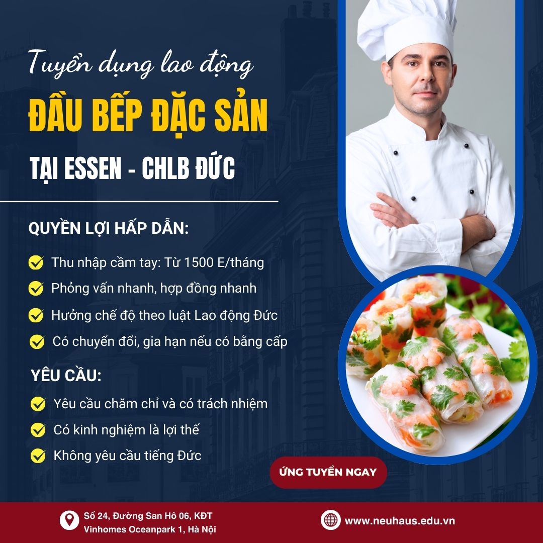 Đầu bếp đặc sản – Essen: Vị trí này dành cho những ứng viên có tay nghề đặc biệt, muốn phát triển bản thân tại môi trường ẩm thực đa văn hóa. Lương thỏa thuận khi phỏng vấn, cam kết thu nhập thực nhận khoảng 1.500 EUR/tháng.