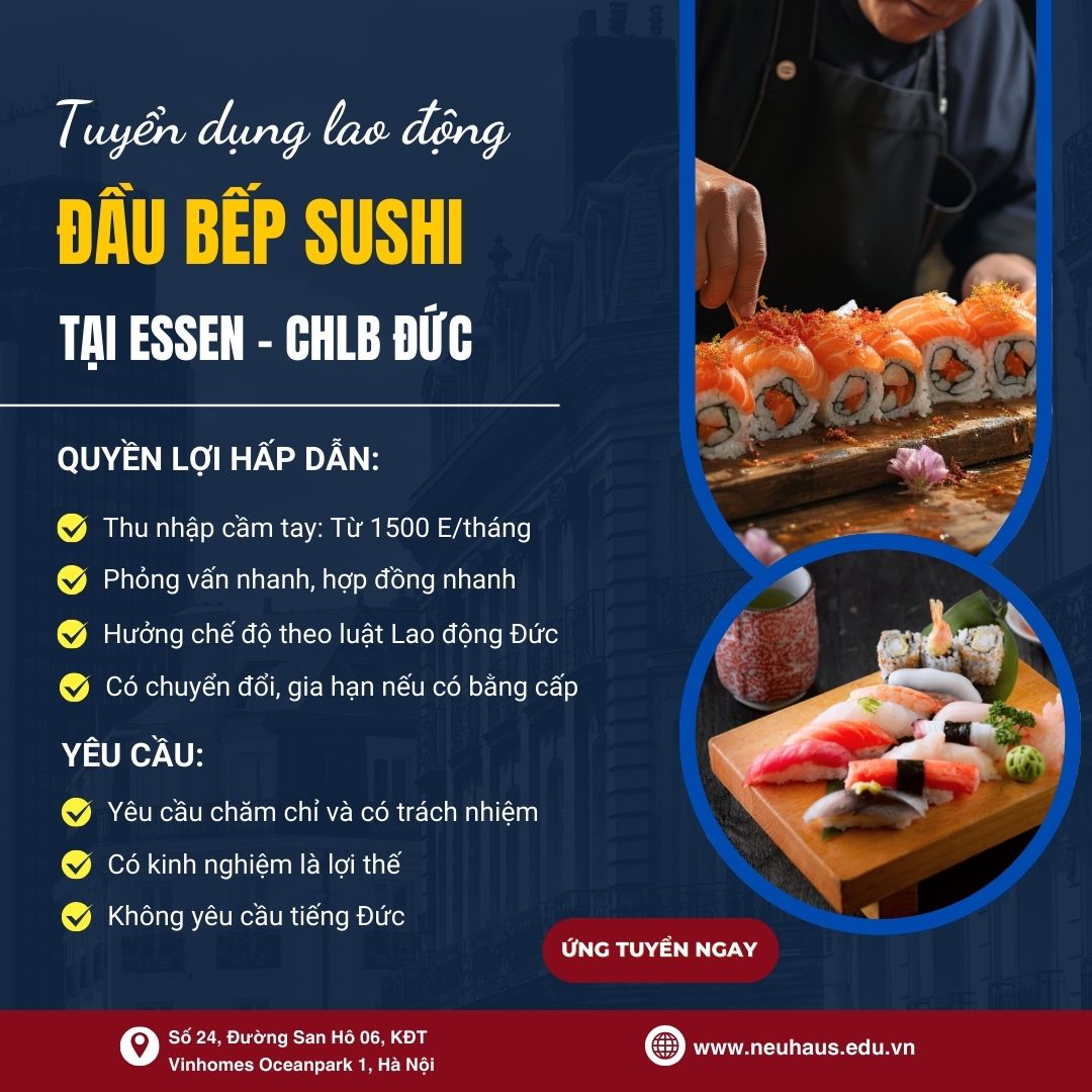 Bếp sushi – Essen: Nhu cầu tuyển dụng sushi chef tại Đức vẫn rất lớn. Doanh nghiệp tại Essen cam kết mức lương cầm tay sau khi trừ ăn ở cũng ở mức 1.500 EUR/tháng, đảm bảo ổn định tài chính cho người lao động.