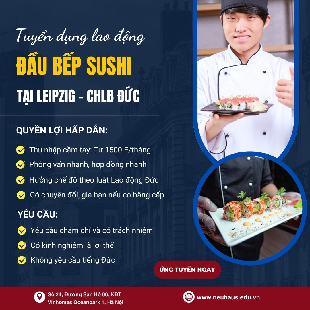 Bếp sushi – gần Leipzig: Lương sẽ được thỏa thuận khi phỏng vấn, tuy nhiên doanh nghiệp cam kết mức thu nhập cầm tay sau khi đã trừ ăn ở đạt 1.500 EUR/tháng. Đây là cơ hội tốt cho những đầu bếp có kinh nghiệm sushi hoặc mong muốn học hỏi thêm trong môi trường chuyên nghiệp.