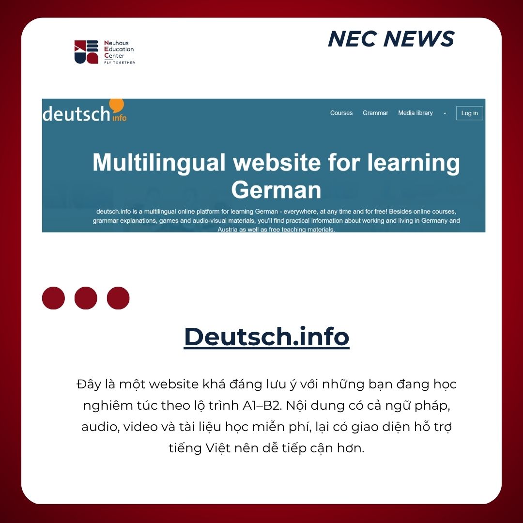 Đây là một trong những nền tảng đáng chú ý nhất nếu bạn muốn học bài bản hơn. Bài tổng hợp của Thế Giới Di Động cho biết deutsch.info có các bài học từ A1 đến B2, phần ngữ pháp chi tiết, thư viện âm thanh và video, cùng giáo án học tập miễn phí. Trên nguồn chính thức, deutsch.info hiện cũng giới thiệu bốn khóa học tổng quát A1, A2, B1, B2, đi kèm nội dung ngữ pháp, thư viện media và thông tin thực tế về cuộc sống ở Đức và Áo. Với người chuẩn bị du học hoặc làm việc tại Đức, đây là nguồn học có tính ứng dụng khá cao.