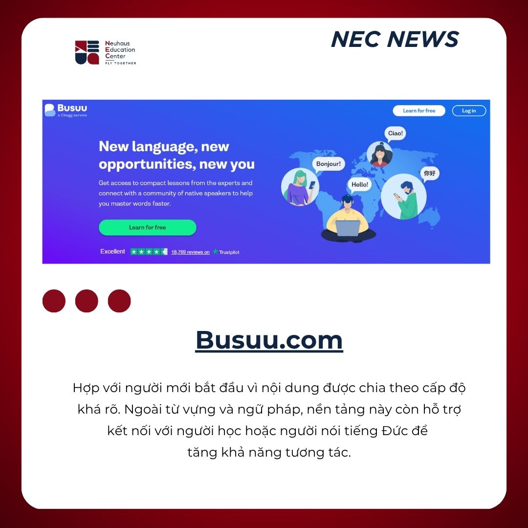 Busuu phù hợp với những người thích học theo lộ trình rõ ràng và muốn có cảm giác “được dẫn dắt” trong suốt quá trình học. Bài tổng hợp của Thế Giới Di Động mô tả Busuu là website hỗ trợ nhiều trình độ từ cơ bản đến nâng cao, đồng thời có các bài học về từ vựng, ngữ pháp và cơ hội giao lưu với người học khác. Ở thời điểm hiện tại, Busuu vẫn giới thiệu khóa học tiếng Đức trực tuyến với các bài học theo tiến độ, nội dung có người bản ngữ xuất hiện và phần ôn tập ngữ pháp, từ vựng tương đối rõ ràng.